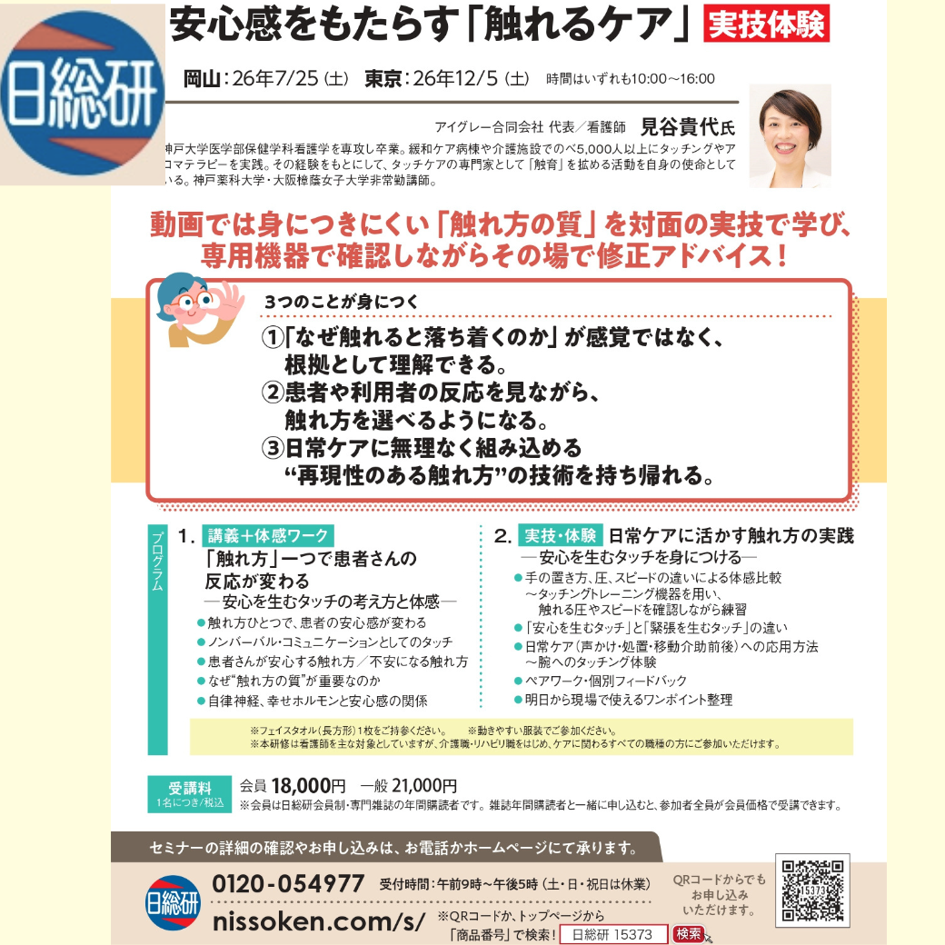 【5月・東京開催】 触れることで、不安をやわらげ、 患者さんに安心を届けられる看護へ― 関東では数少ない対面実技講座 ― 在宅や緩和ケアの現場で、 「この患者さんに、どう触れたらいいのだろう」 と迷ったことはありませんか